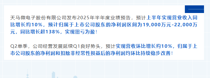 天馬微電子股份有限公司發布2025年半年度業績預告,預計上半年實現營業收入同比增長約10%,預計歸屬于上市公司股東的凈利潤區間為19,000萬元-22,000萬元,同比增長超138%,實現扭虧為盈!Q2